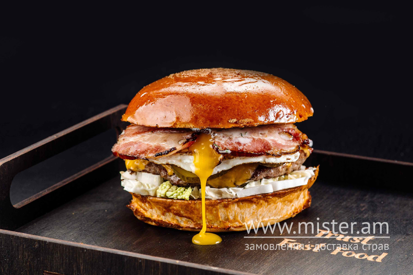 Назва говорить за себе, окрім стандартного набору: булочки, пекінки, котлети, огірка та кармелізовано цибульки сюди входить бекон зі скоринкою, яйце, сир чеддер, що створює неповторний смак.