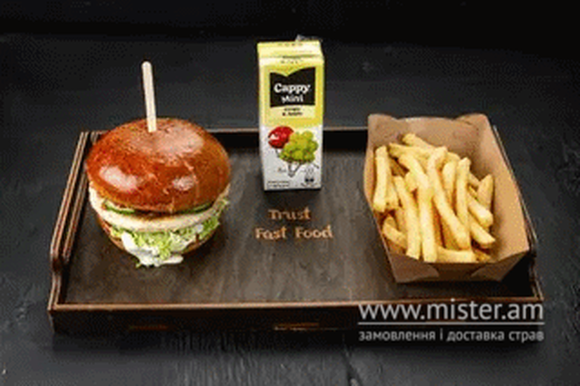 Chicken бургер, маленька картопля фрі,сочок.