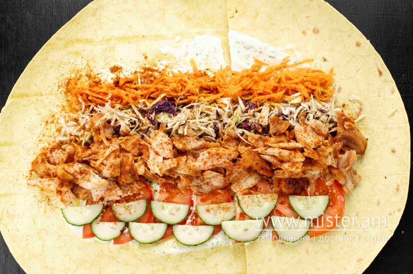 Лаваш, для любителів великих порцій - більше курятини та овочів, фірмові соуси, хрумка цибулька.