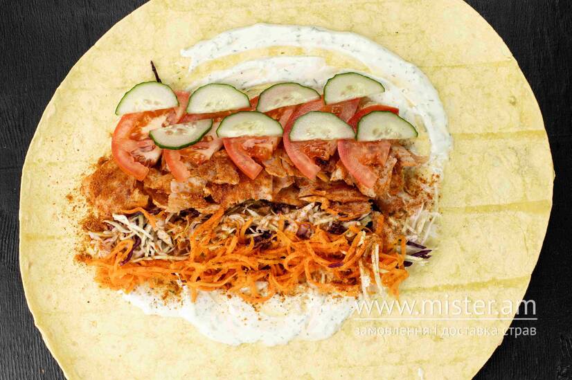 Лаваш, соковита курятина, сезонні овочі, фірмові соуси, хрумка цибулька.