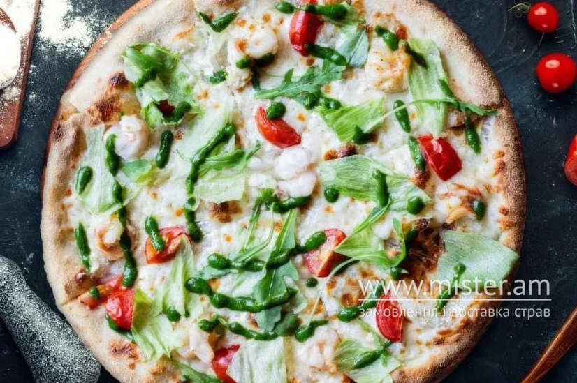 Вершкова основа, сир моцарела, шпинат, креветка, чері, мікс салату, часник, 580 г.