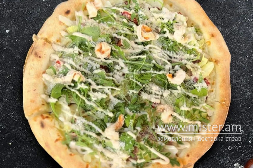 Вершкова основа, сир моцарела, креветки, бекон, пармезан, мікс салату, чері, соус цезар, 850 г.