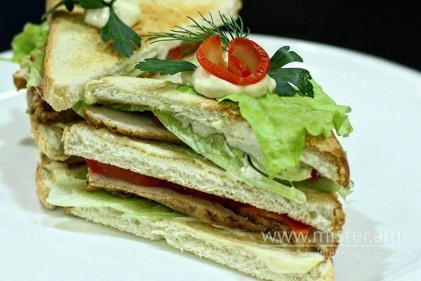 Фірмовий сендвіч, який складається із запеченого курячого філе, помідорів, листя салату, заправлений соусом цезар.
