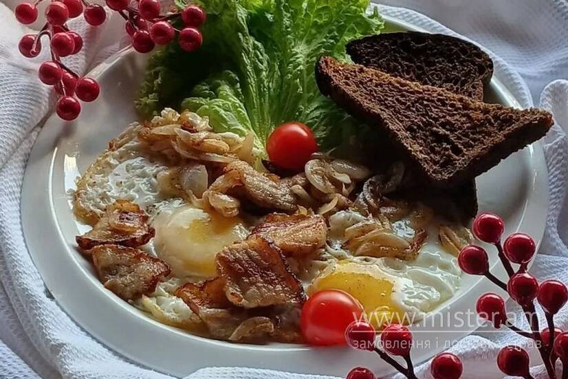 Поживний сніданок у який входять такі соковиті інгрідієнти: яєчня, смажена на салі, підсмажена ріпчата цибуля, черрі, листя салату та бородинський хліб.