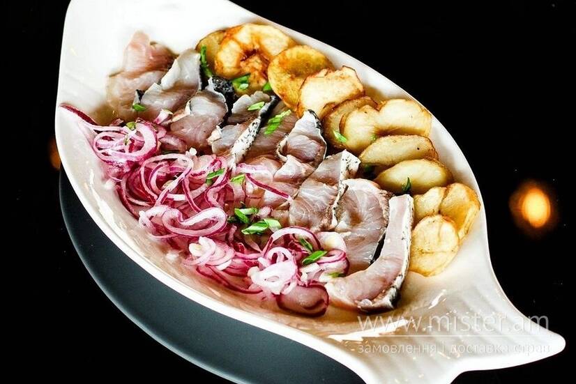 Класичний домашній оселедець із філе товстолоба. Подаємо з картоплею та маринованою цибулею.