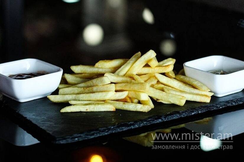 Тонко нарізані брусочки картоплі, обсмажені у фритюрі до золотистої хрусткої скоринки.