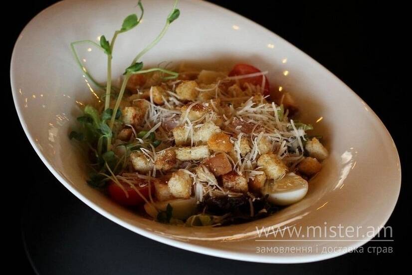 В основі свіже листя салату, з додаванням запечених шматочків курячої грудки, соковитий бекон, перепелині яйця та черрі, заправляємо соусом цезар та посипаємо пармезаном.