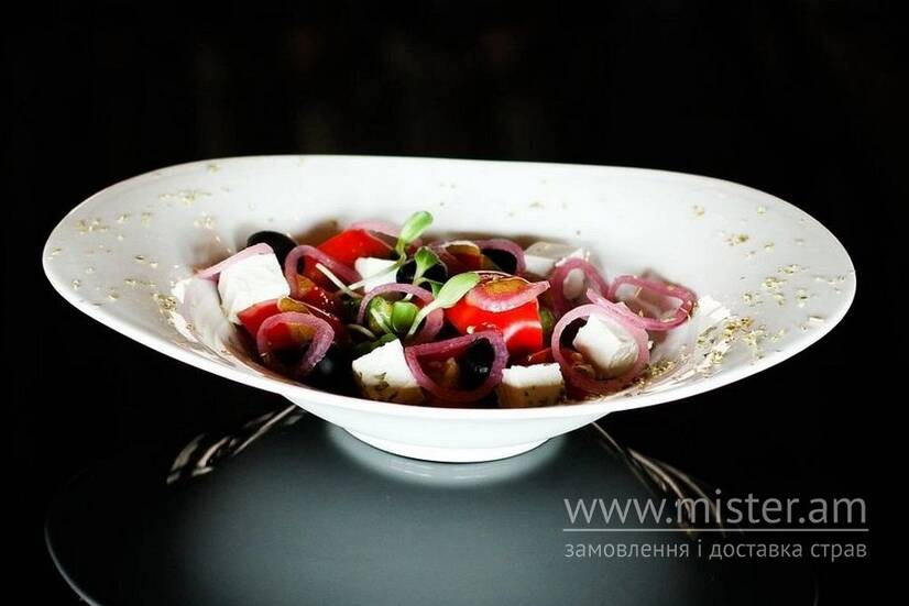 Салат традиційно готуємо із таких основних інгредієнтів: соковиті помідори, огірки, болгарський перець, маслини, сир фета, сушений орегано та фірмовий медово-гірчичний соус.
