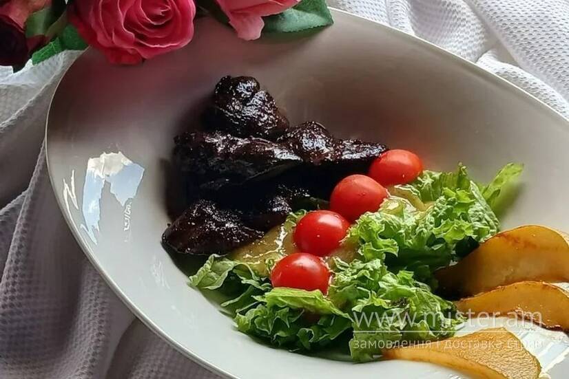 Основу салату складає обсмажена до рум`яності куряча печінка, яка обсмажується у червоному вині, подається на подушці зі свіжого салатного міксу, з додаванням карамелізованих скибок груші, помідорів чері.