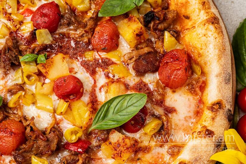 Томатний соус, сир Моцарела, свинина рвана барбекю, ананас, перець пепероні, конфі з чері, базилік свіжий, мед, паприка копчена та приправа чилі.