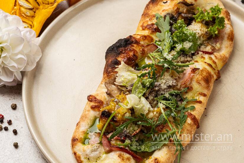 Соус Бешамель, вершки, сир Моцарела, гриби гливи смажені, бекон, гарбузове пюре, мікс салату, сир Пармезан, італійська заправка.