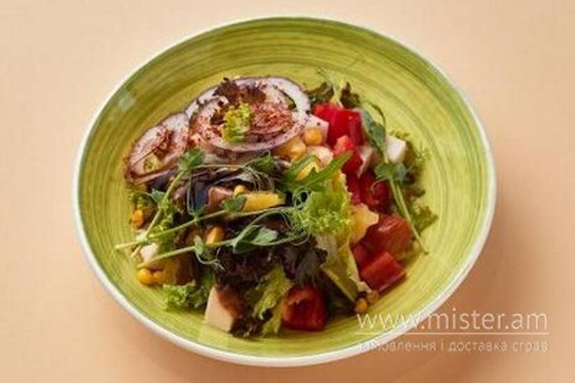Мікс салату, копчене куряче філе, ананас, кукурудза, перець болгарський свіжий, цибуля. Заправка на вибір.