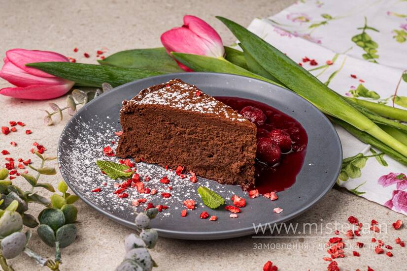 Кейк-суфле з чорного шоколаду, какао, крем сиру з вишнею конфі.