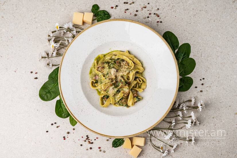 Паста з беконом, шпинатом, жовтками, соусом песто, сиром Пармезан, на білому сухому вині.