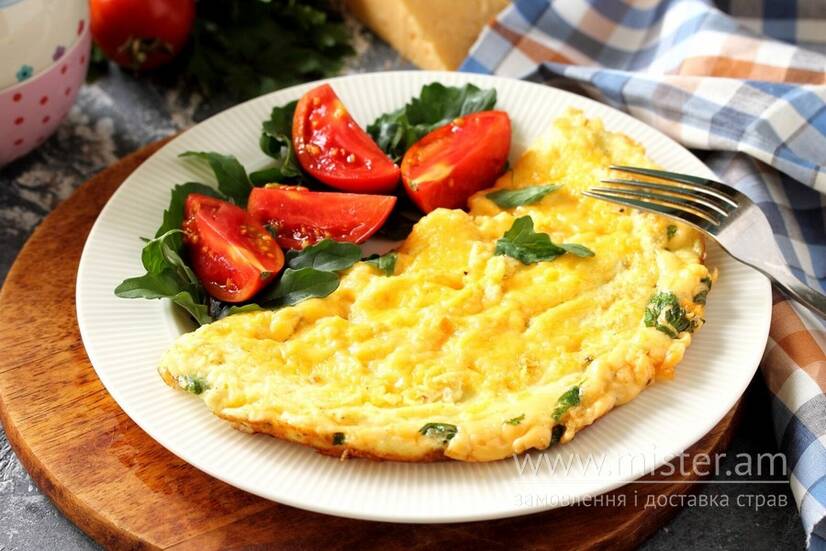 Яйця курячі, борошно, молоко, тост з сирним кремом, овочевий салат, цитрусово-гірчична заправка, шинка, сир.