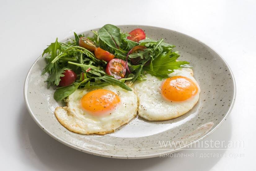 Яйця курячі, тост з сирним кремом, овочевий салат, цитрусово-гірчична заправка.