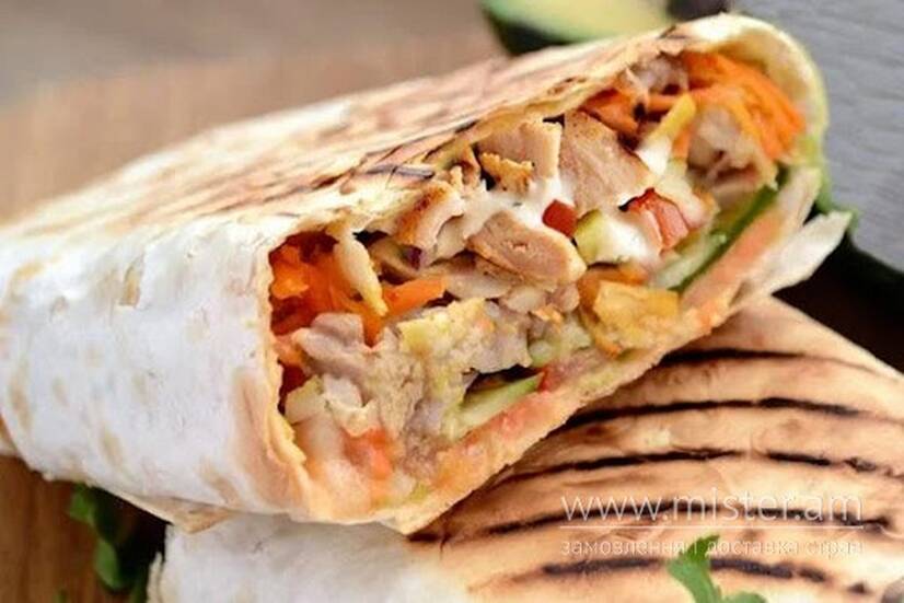 Лаваш, м`ясо яловичини, капуста, огірок солоний, соус, сир, томат, перець болгарський.