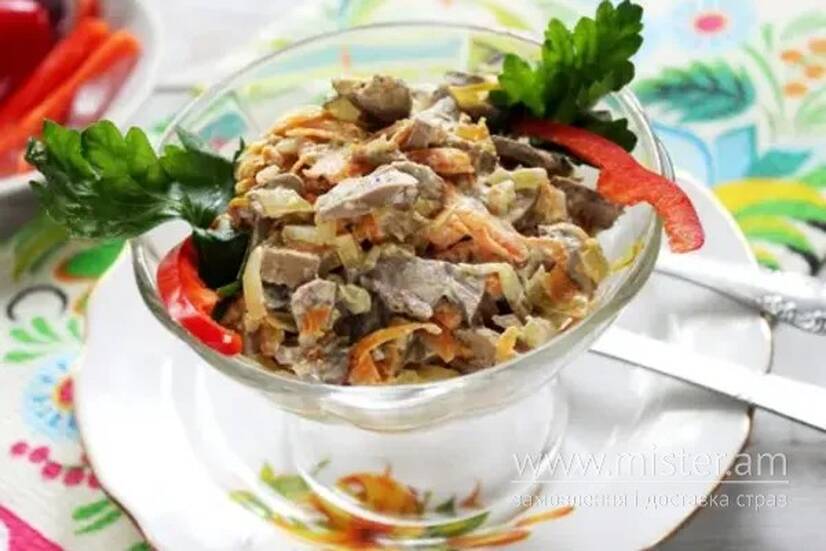 Печінка куряча, печериці, огірок, яйце куряче, соус Цезар, зелень.