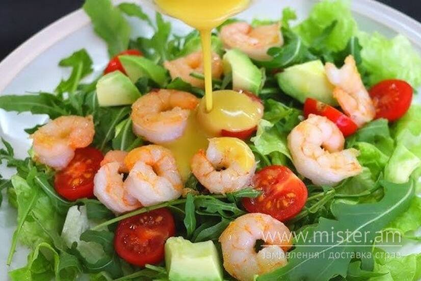 Мікс салатний, креветки, помідори, авокадо, цитрусово-гірчична заправка.