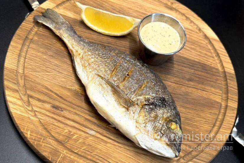 Смажене на грилі дорадо, подається зі сметанковим соусом та лимоном.