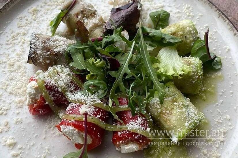 Рулетики з кабачка та вершкового сиру з часником та соусом Песто. Рулетики з баклажану з вершковим сиром та часником з горіховим соусом. Рулетики з перця та сиру фета з медовим соусом.