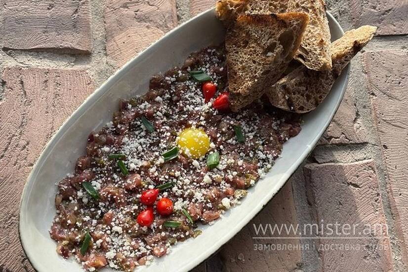 Телятина, корнішони, червона цибуля, каперси, табаско, кетчуп, сіль, перець вустерський соус, чіабата, пармезан.