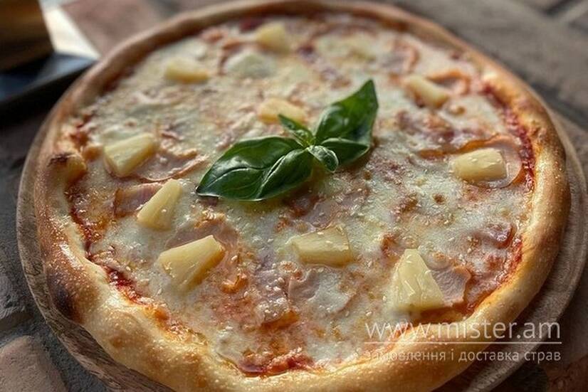 Томатний соус, моцарела, ананаси, куряче філе, бекон, кунжут, базилік.