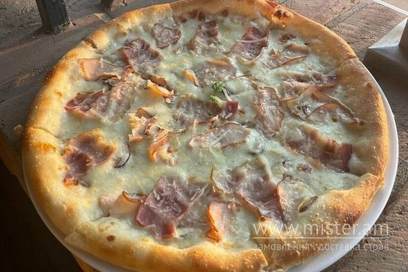 Вершковий соус, печериці, моцарела, філе куряче, бекон, пармезан.