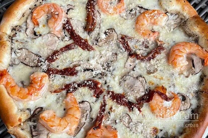Трюфельний соус, моцарела, печериці, креветки, в`ялені томати, пармезан.