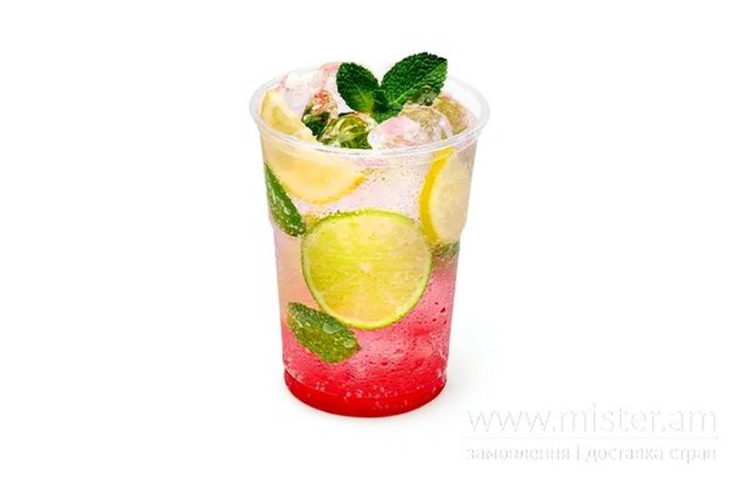 Лід, лайм, м'ята, лимон, сироп полуниця, спрайт.