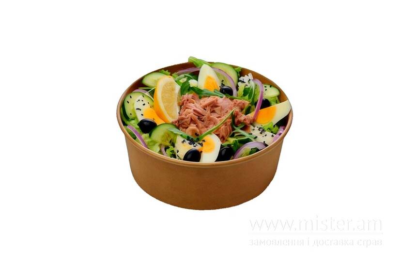 Тунець, моцарела, маслини, яйце варене, салат айсберг, рукола, огірок свіжий, салат, маринована цибуля, лимон, кунжут смажений, соус айолі.