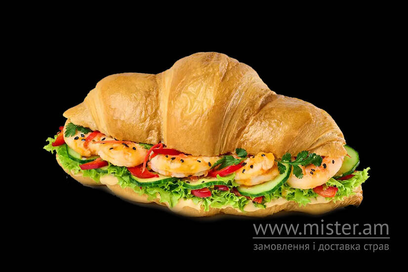 Креветка, огірок, перець болгарський, салат лолло біонда, салат айсберг, імбир маринований, кінза, чорний кунжут, соус asian BBQ, соус айолі азійський.