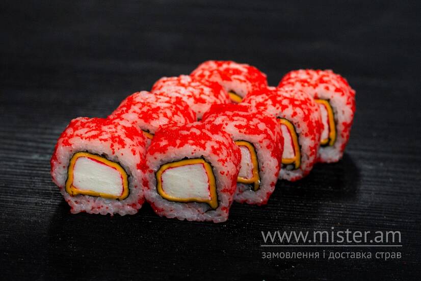 Рис, норі, сніжний краб, ікра масаго, сир тостовий.