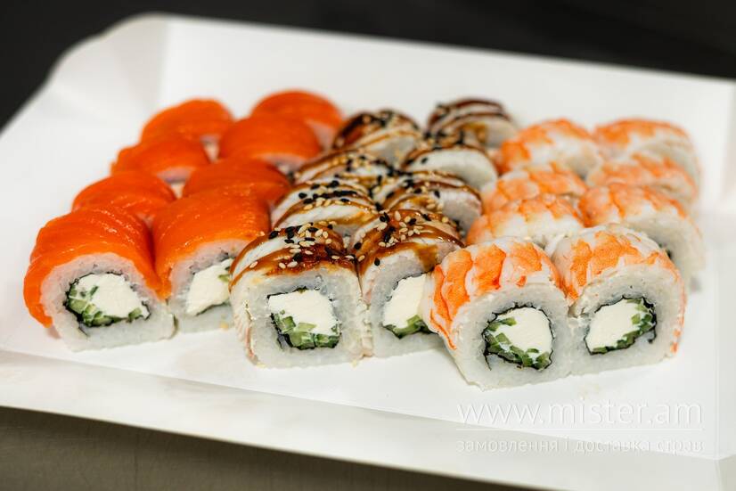 Філадельфія з лососем, Філадельфія з вугрем, Філадельфія з креветкою.