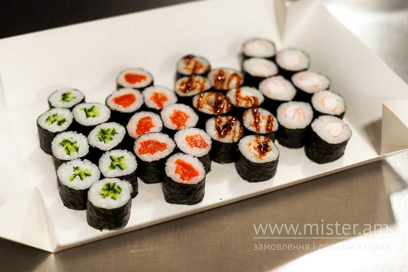 Макі з лососем, Макі з вугрем, Макі з креветкою, Макі з огірком.
