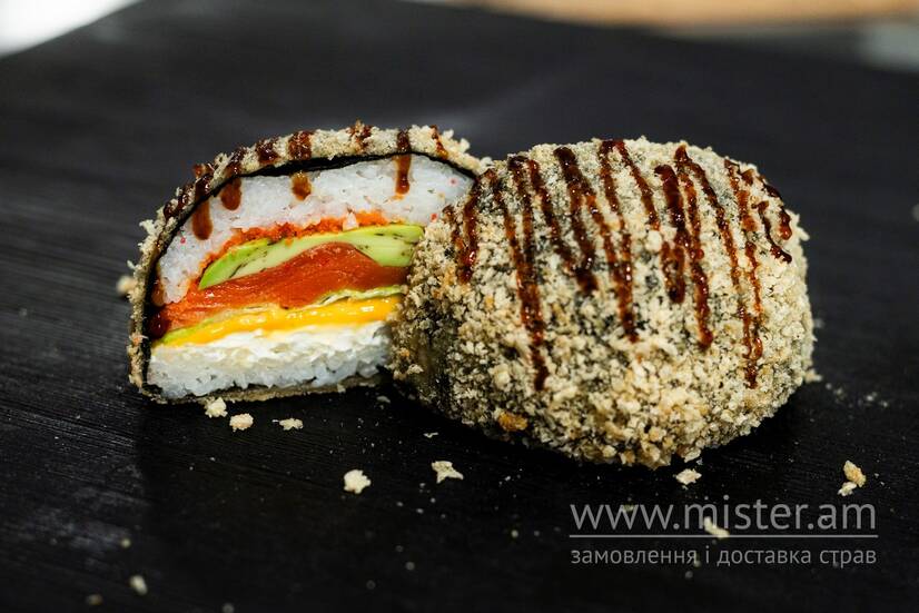 Рис, норі, лосось, авокадо, салат айсберг, крем-сир, сир тостовий, ікра масаго, соус унагі.