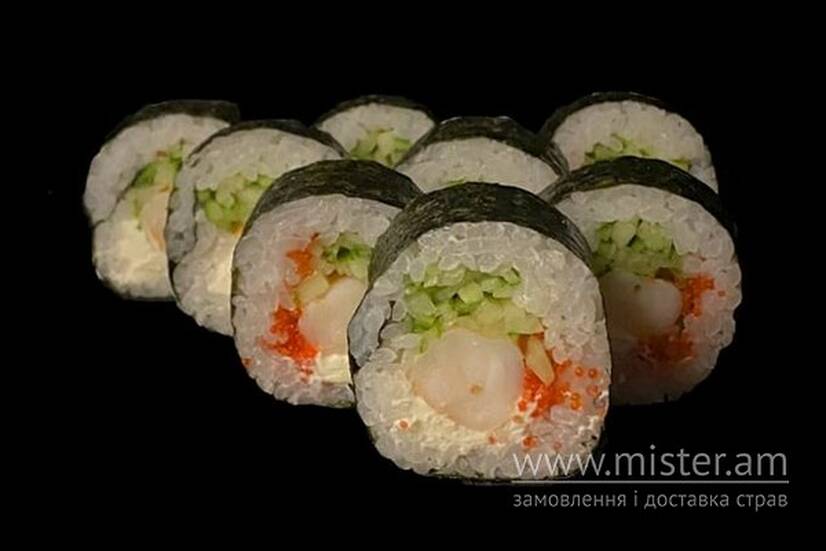 Тигрова креветка, водорості норі, рис, сир вершковий, ікра Тобіко, огірок, імбир, васабі, соєвий соус.