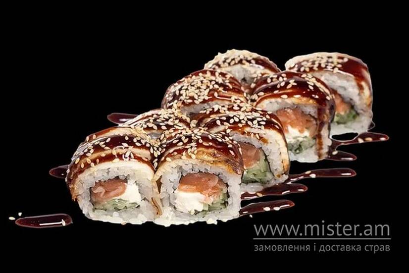 Вугор, рис, лосось, крем-сир, огірок, норі, імбир, васабі, соєвий соус, унагі соус, кунжут.