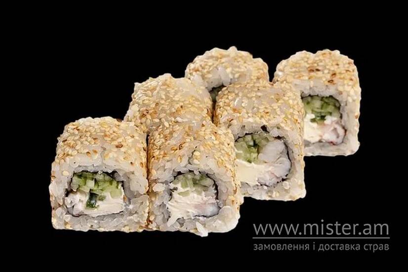 Рис, тигрова креветка, огірок, кунжут, крем-сир, норі, васабі, імбир, соєвий соус.