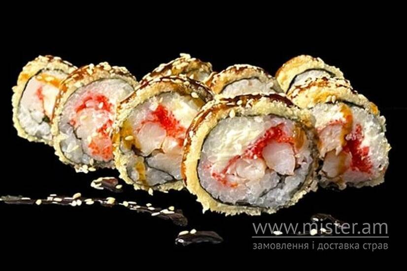 Рис, тигрова креветка норі, темпура, ікра Тобіко, сир вершковий, кунжут, унагі соус, імбир, васабі, соєвий соус.