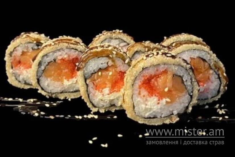 Лосось, сир вершковий, норі, рис, ікра Тобіко,темпура, панірувальні сухарі, кунжут, унагі соус імбир, васабі, соєвий соус.
