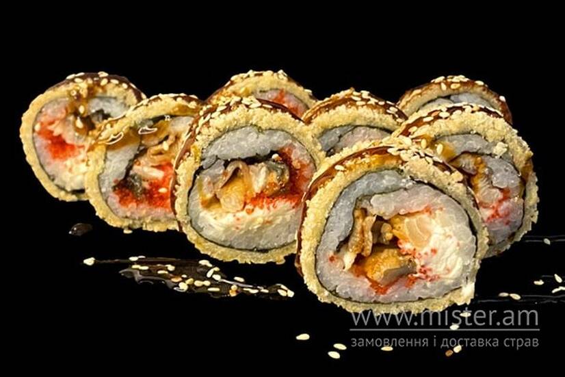 Вугор, сир вершковий, норі, рис, ікра Тобіко,темпура, панірувальні сухарі, кунжут, унагі соус імбир, васабі, соєвий соус.
