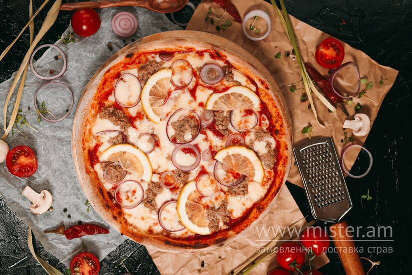 Соус томатний, моцарела, тунець, цибуля, лимон.