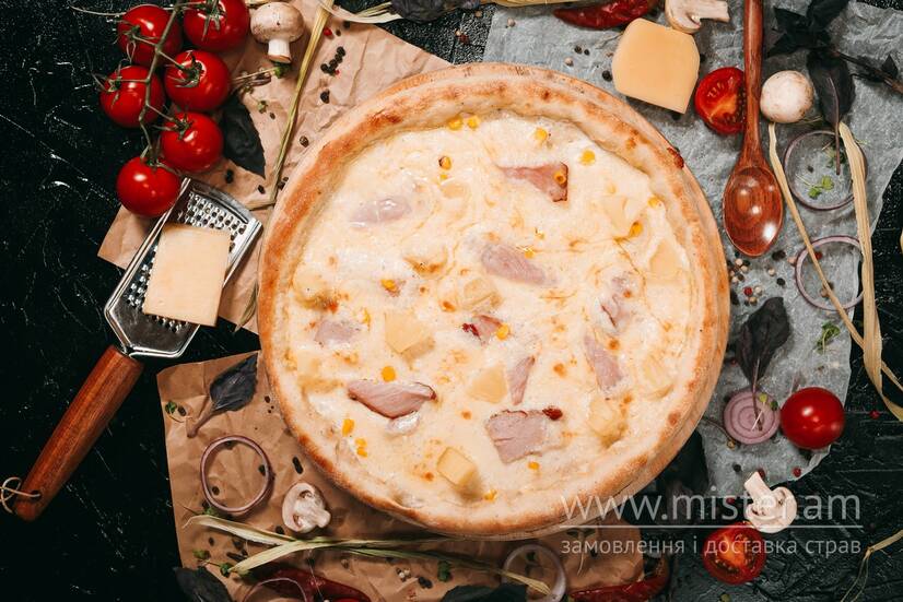 Соус томатний/кремовий, моцарела, шинка куряча, ананас, кукурудза.