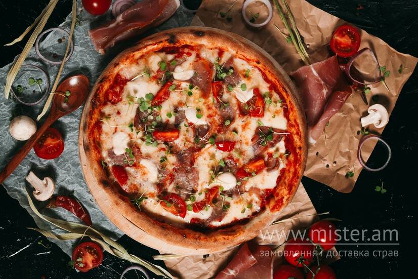 Соус томатний, моцарела, шинка прошуто, помідор, міні моцарела, пармезан, мікрогрін.