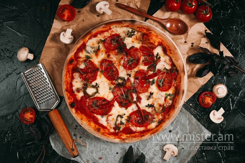 Соус томатний, моцарела, салямі гостра, халареньйо, чилі, мікрогрін.