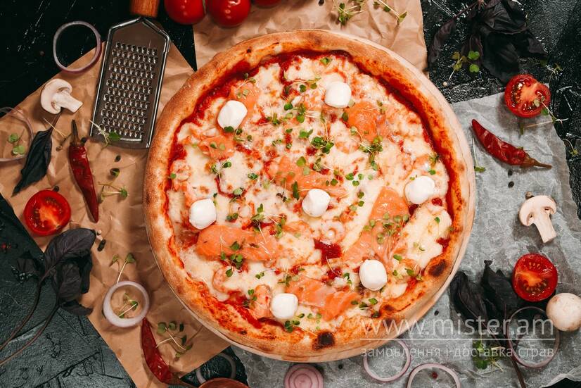 Соус томатний/кремовий, моцарела, креветки, лосось, міні моцарела, мікрогрін.