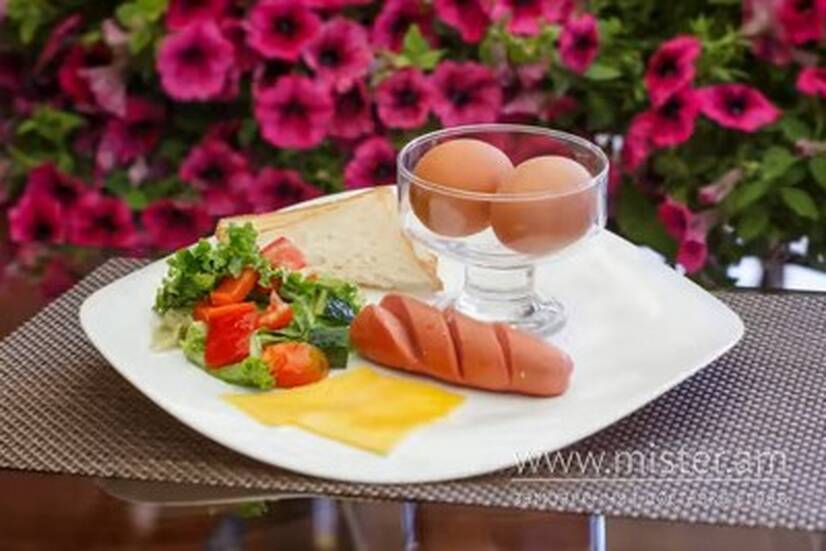 Яйця, сир твердий, сосиска, огірки, помідори, перець болгарський, сік лимону, листя салату, хліб тостерний.