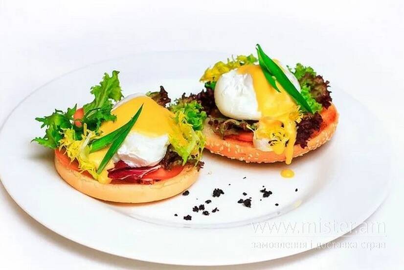 Яйце, шинка, помідори, цибуля зелена, булочка з кунжутом, мікс салату, соус Голандський.