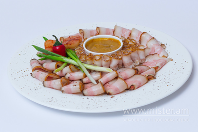 Холодні закуски: Рибне озеро, Закуска по-італійськи, Сирне плато, Карпачо з телятини, Тар-тар з лосося, Огірки по-азіатськи, Брускетти з томатами, Оселедець з картоплею, Філе скумбрії холодного копчення, Брускетти з лососем, Вугор унагі, Лосось слабосолений, Опеньки мариновані, Квашені огірки, Глива маринована, Печериці мариновані, Слива маринована, Капуста квашена, Оселедець з цибулею, Карпаччо з язика